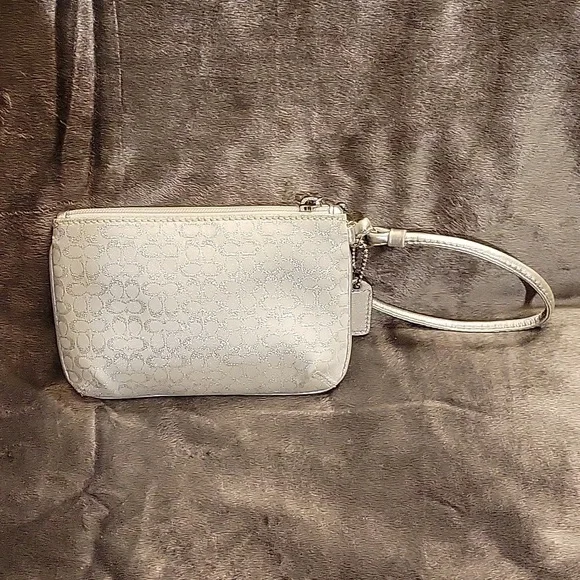 This elegant Coach white and silver metalic wristlet is perfect for any occasion. Its sleek design and versatile color make it a must-have accessory. Has a light pretty blue inside. There is some light rubbing on the metalic piping bottom corners and slightly some rubbing on metalic strap pictured. Very pretty wristlet with hang tag. All Sales Final. 😊🤍🩶 Make me an offer!